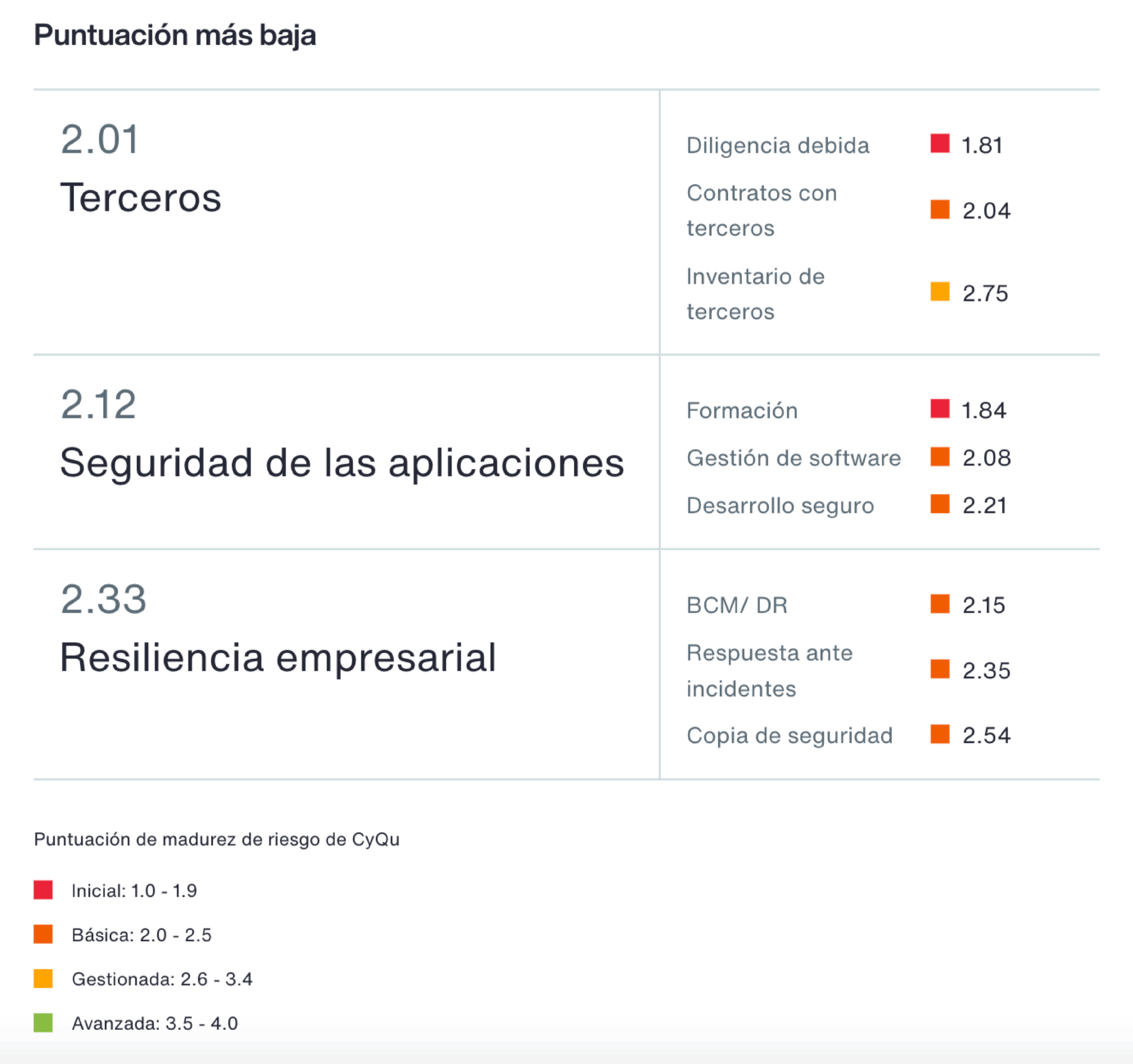El riesgo de terceros, que se refiere al riesgo potencial de proveedores, vendedores o socios, siguió siendo un reto. Esta puntuación es una llamada a la acción para muchas empresas. Los acontecimientos de 2024 ponen de relieve el impacto potencial que puede tener una infracción de terceros.