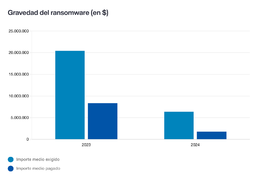 A medida que aumentaba la frecuencia de los ataques de ransomware, los grupos de atacantes ampliaron sus esfuerzos y se centraron en organizaciones más pequeñas. Sin embargo, la gravedad de los ataques disminuyó, en parte gracias al refuerzo de los controles de ciberseguridad y a la preparación ante el ransomware. A nivel mundial, la proporción entre los pagos y el tamaño de las demandas disminuyó hasta el 28 %, desde el 41 % en 2023, y el importe medio de los pagos por ransomware se redujo en un 77 %. Si bien esta disminución de la gravedad es un panorama prometedor, el aumento de la frecuencia de los incidentes de ransomware hace necesario ofrecer orientación sobre cómo informar y gestionar las notificaciones.