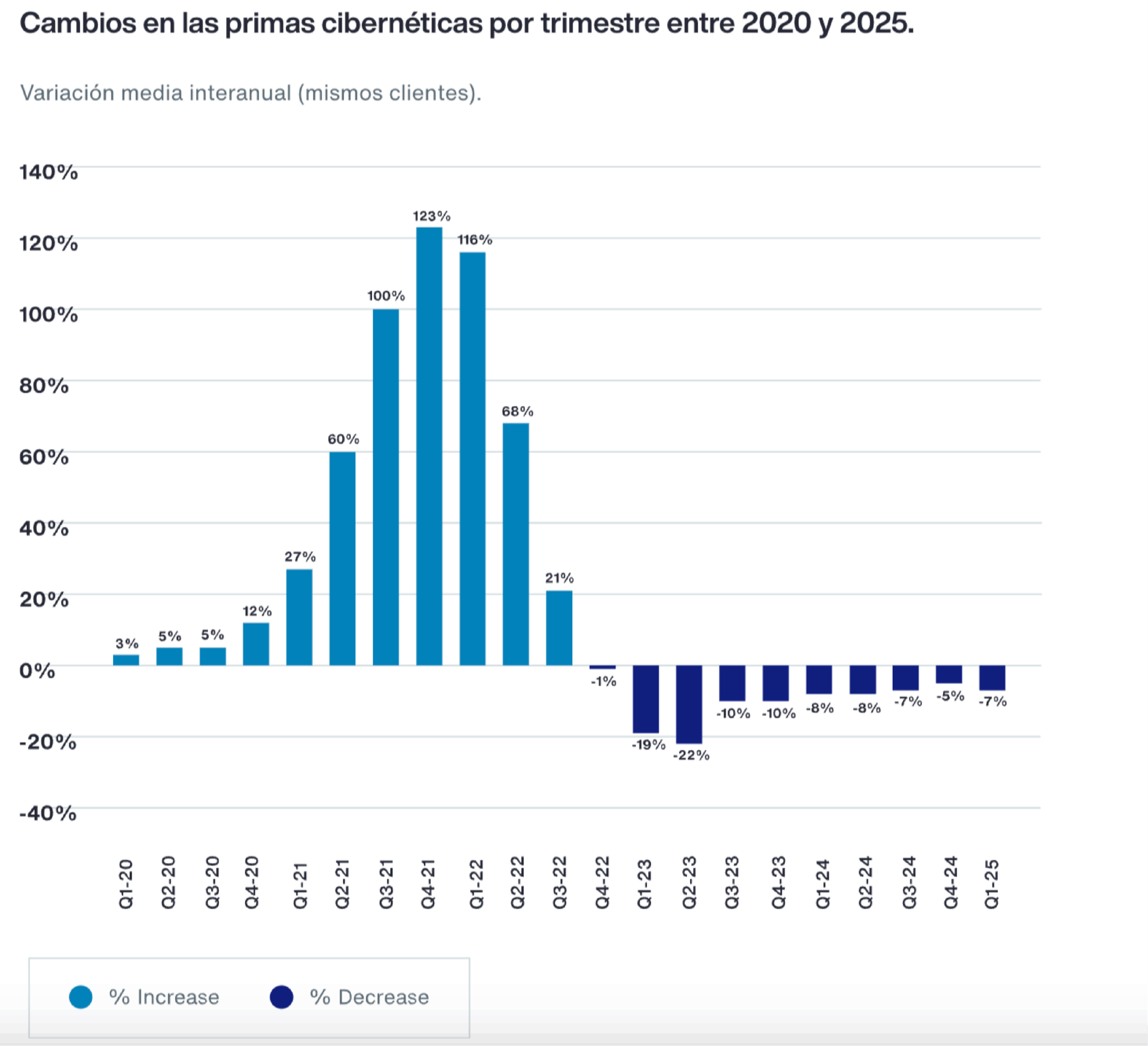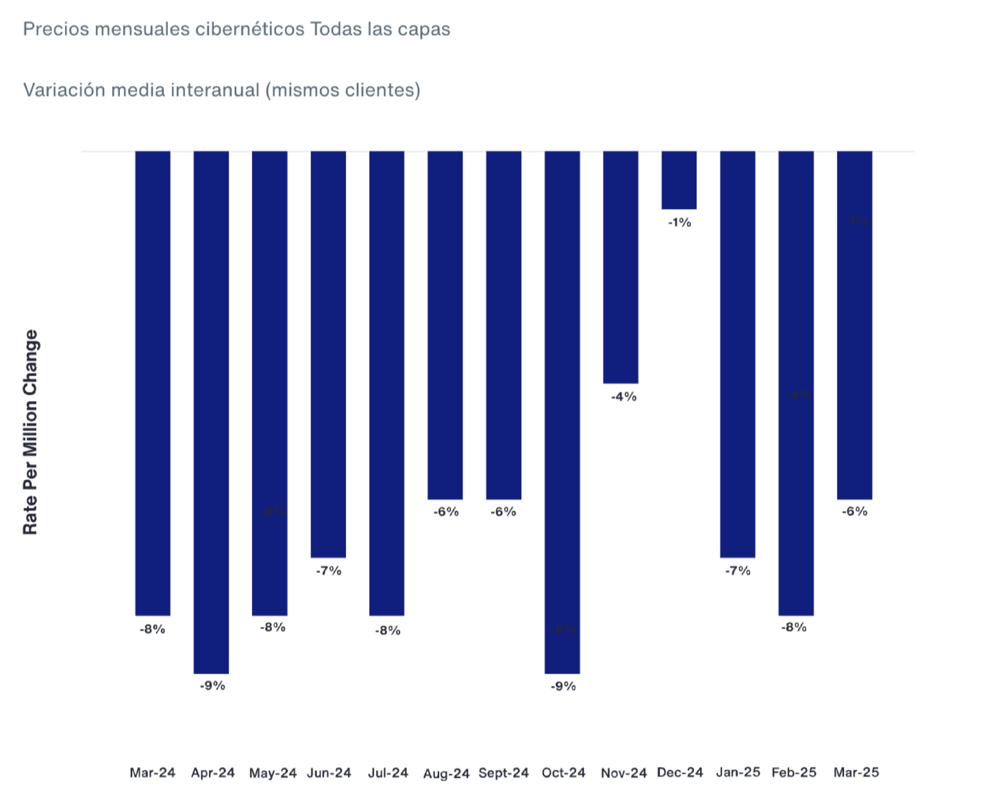 A medida que las organizaciones cumplían con la normativa en 2024, también trabajaban para garantizar los seguros cibernéticos y la suscripción, lo que contribuyó a impulsar la ciberseguridad. Al mismo tiempo, las compañías de seguros experimentaron una mayor competencia. El mercado europeo de seguros nunca ha sido tan accesible gracias a la llegada de muchos nuevos participantes y a la afluencia de capital nuevo al mercado de los seguros cibernéticos, lo que ha dado lugar a una bajada de los precios y a un gran alcance y escala para las renovaciones y los nuevos compradores.